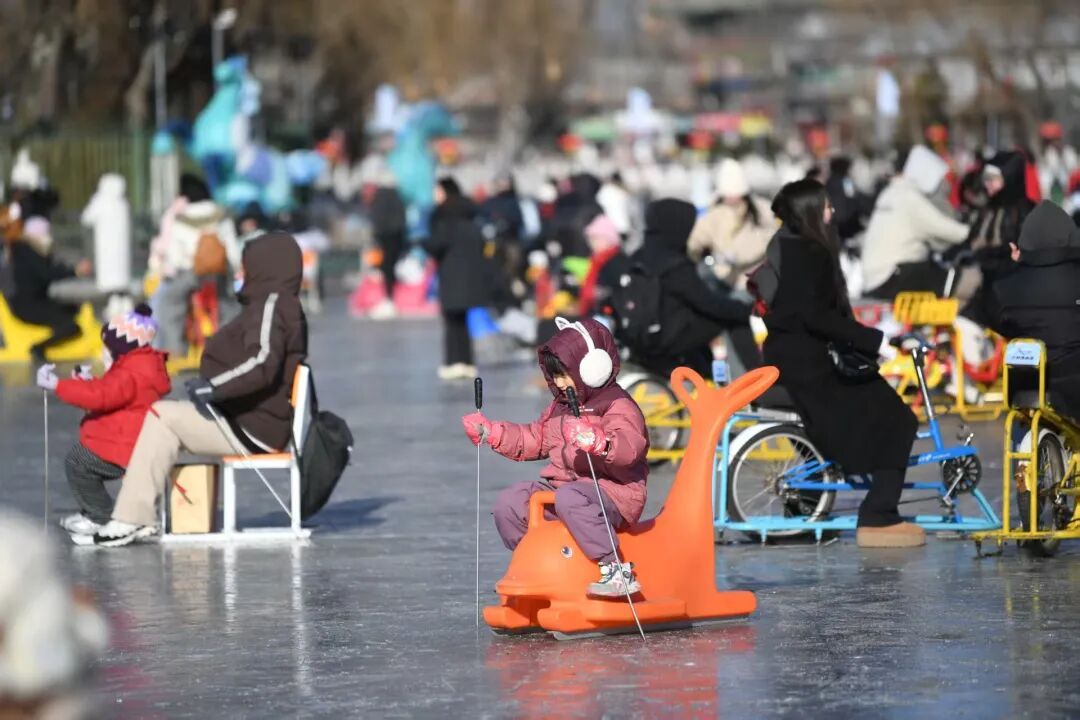 据了解,今年的什刹海冰雪嘉年华以“飞马踏冰”为主题,现场处处洋溢着浓郁的马年节庆氛围。北京青年报记者看到,前海冰场入口及围栏处的道旗等装饰巧妙融入马年元素,单人冰车、双人冰车、冰上自行车等多种设施一应俱全。